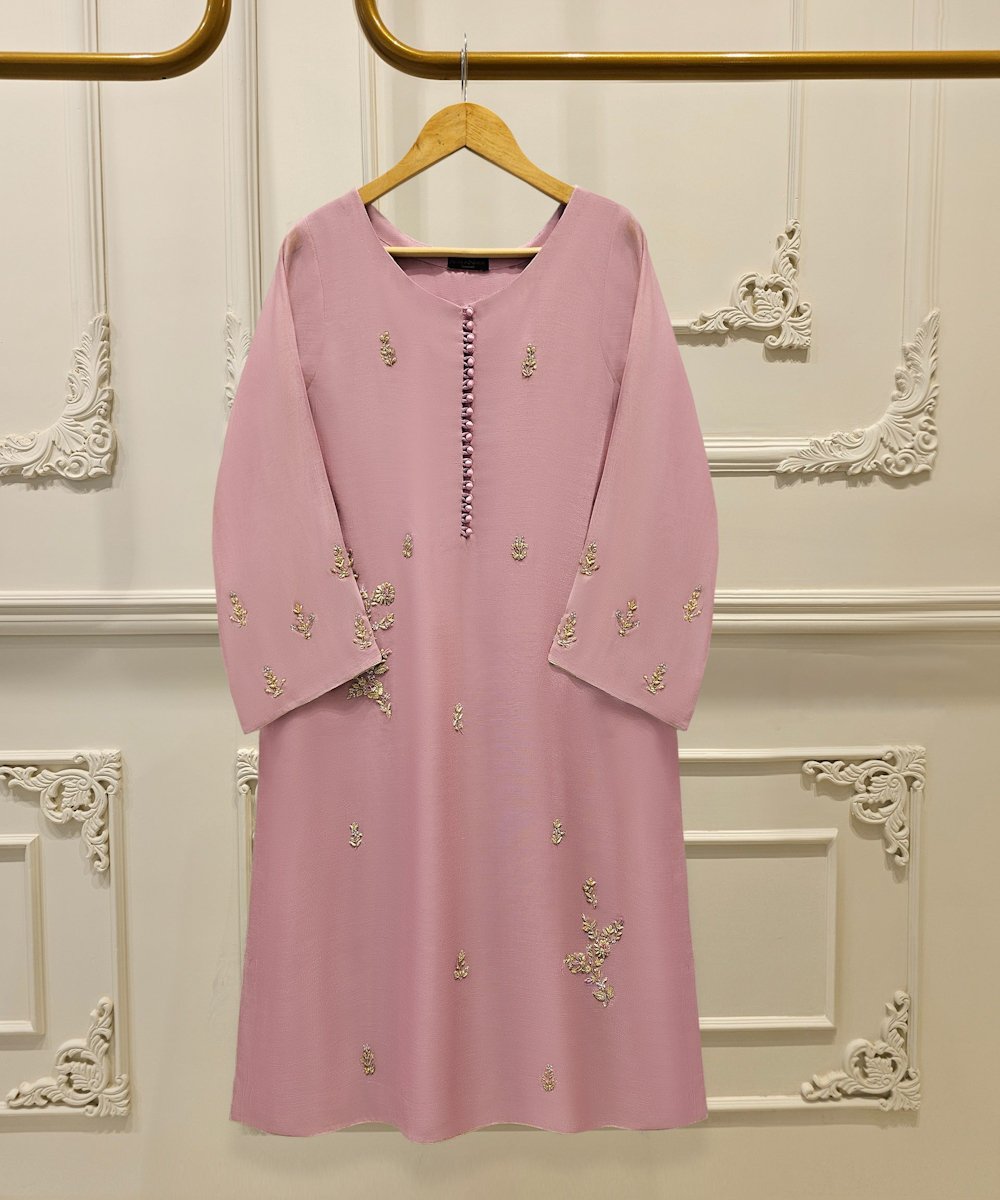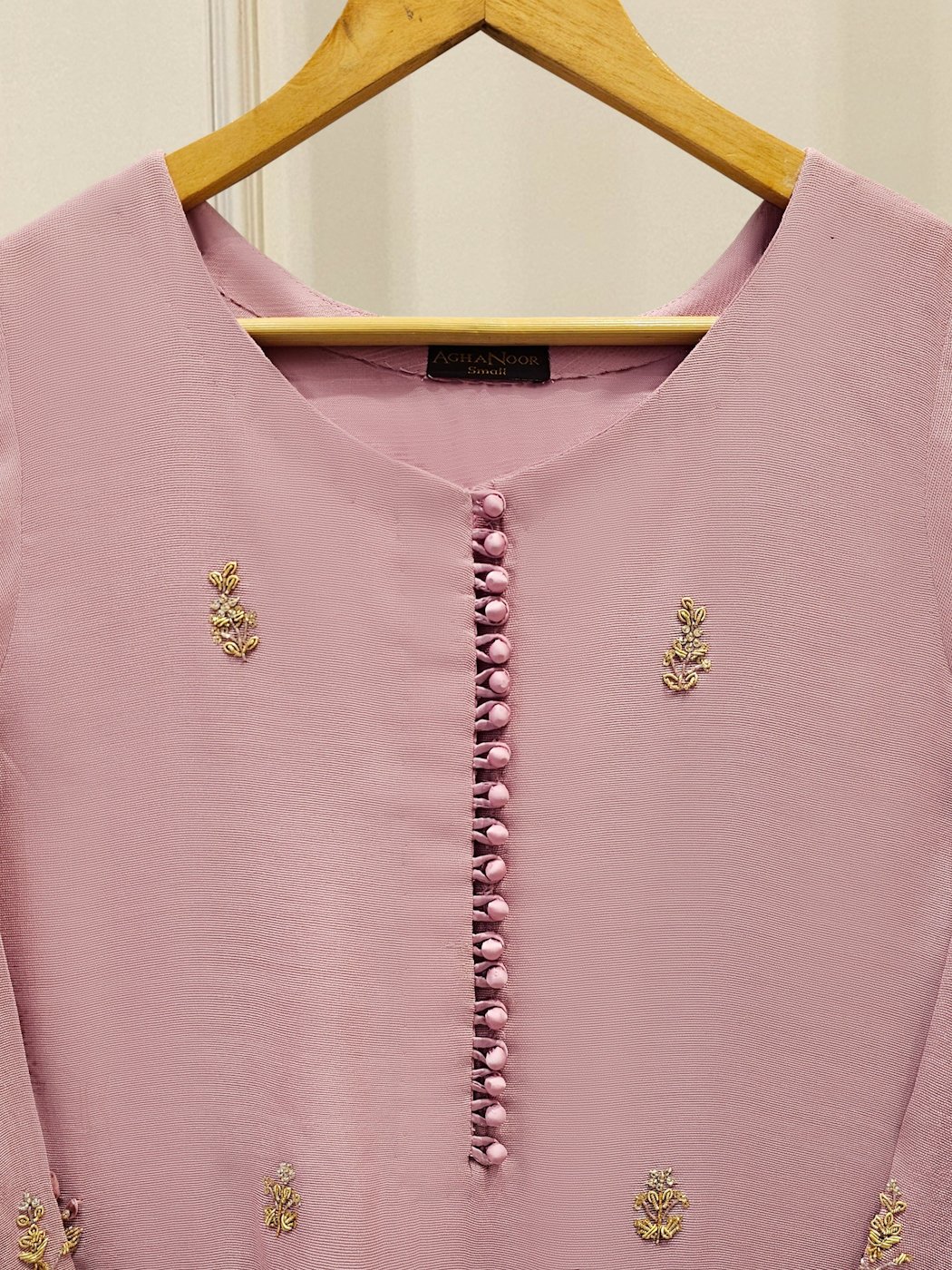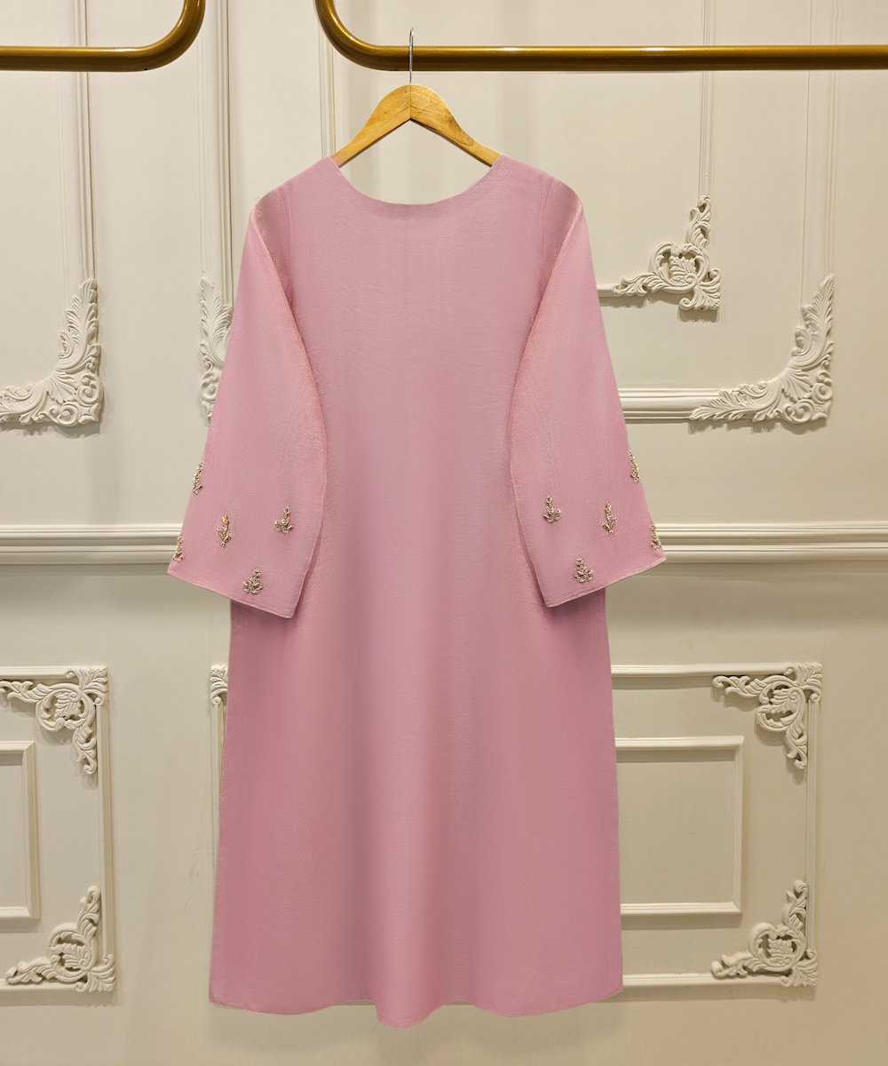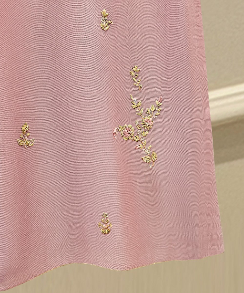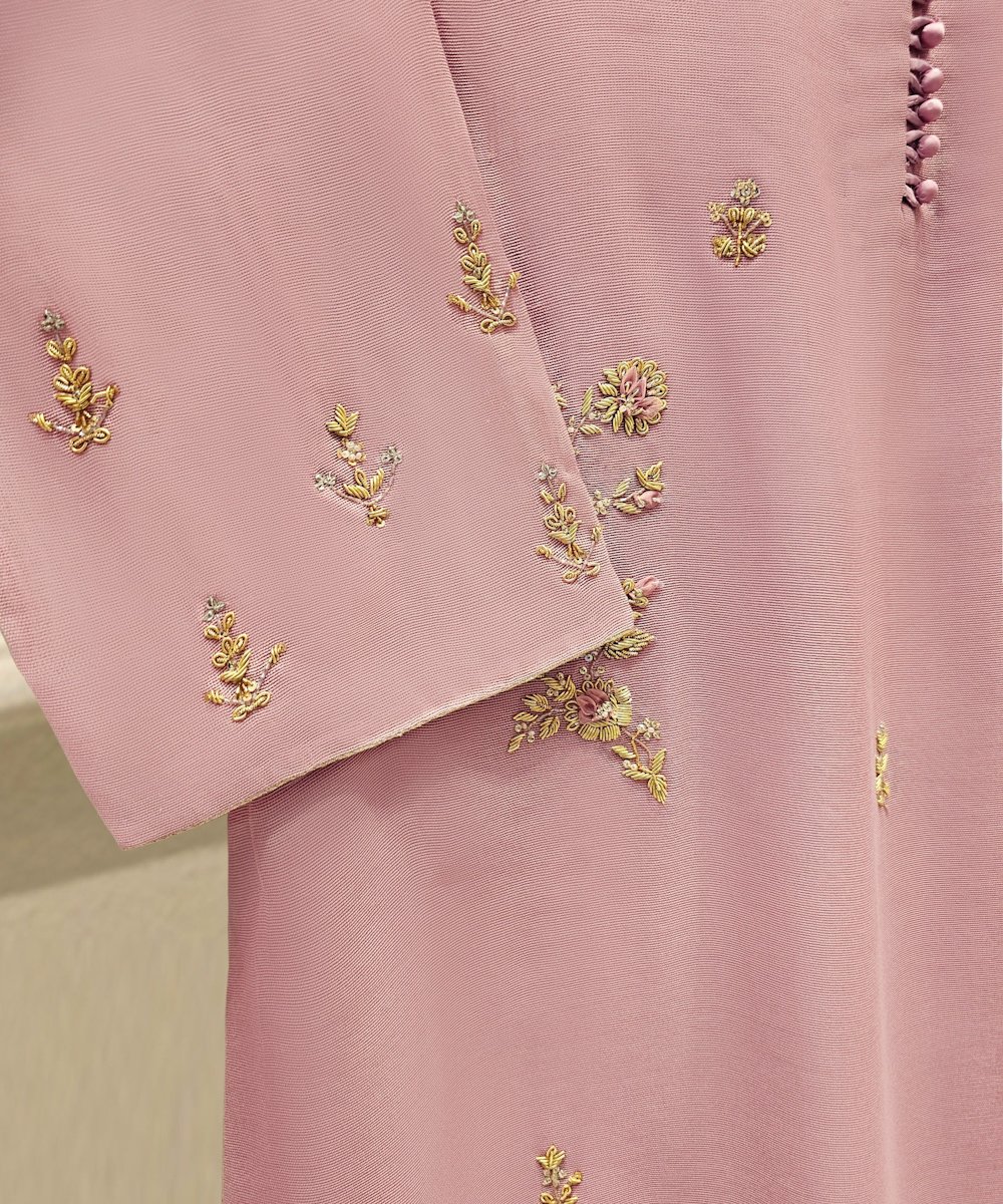 Charming pink cotton net shirt adorned with delicate zardozi work, paired with a matching raw silk trouser. A graceful and versatile outfit perfect for festive and semi-formal occasions.