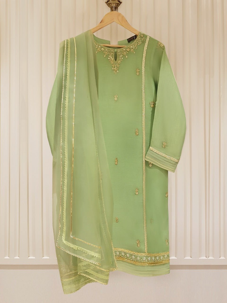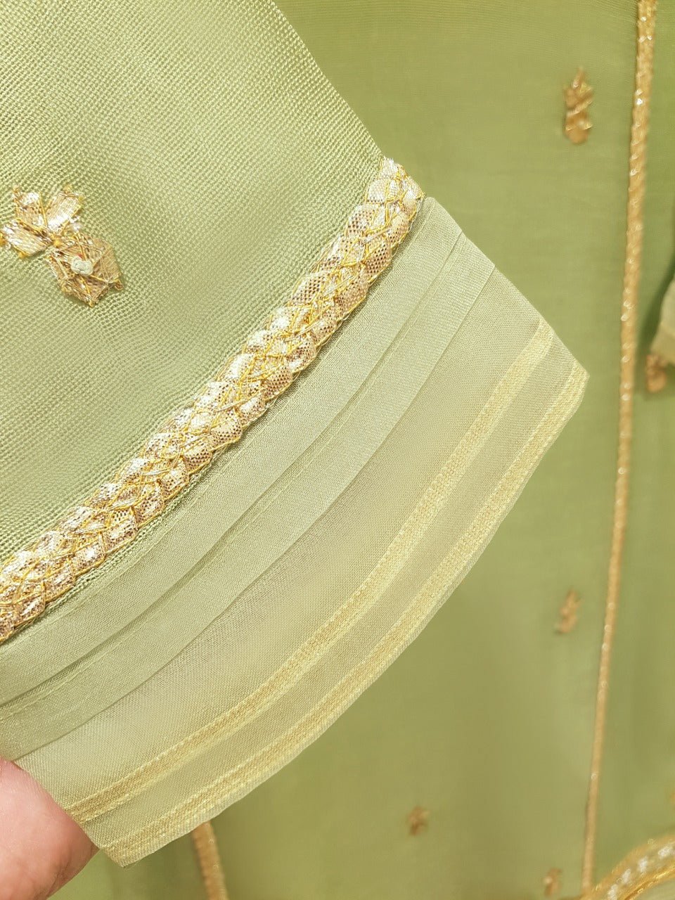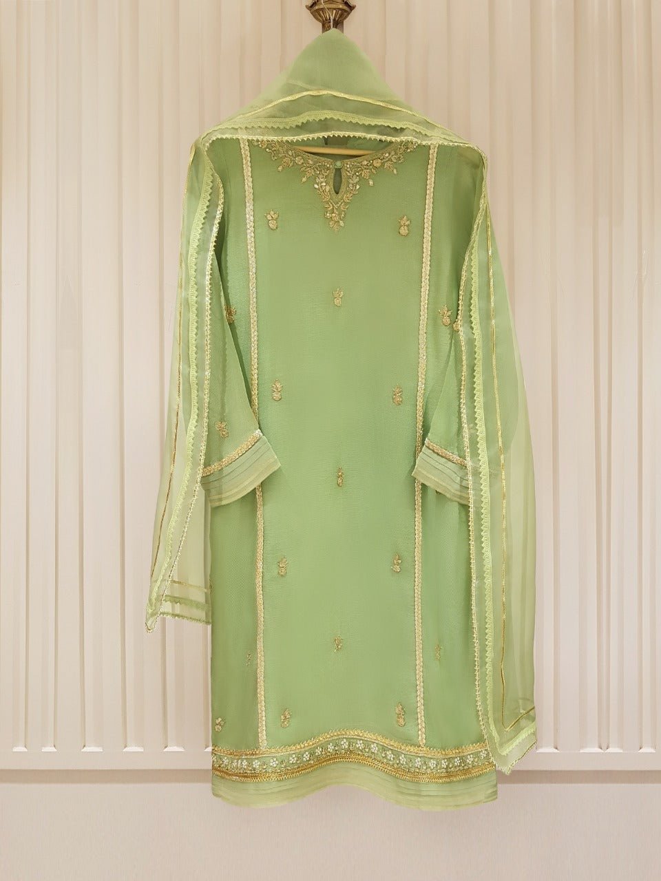 Elevate your style with our pista green embroidered cotton net straight shirt crafted with utmost care and attention to details. The sirt features intricate details of zardozi and gota work on neckline, sleeves, daaman and boti spry on all over shirt and dupatta, adding a touch of timeless charm..