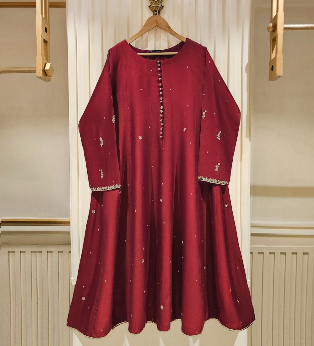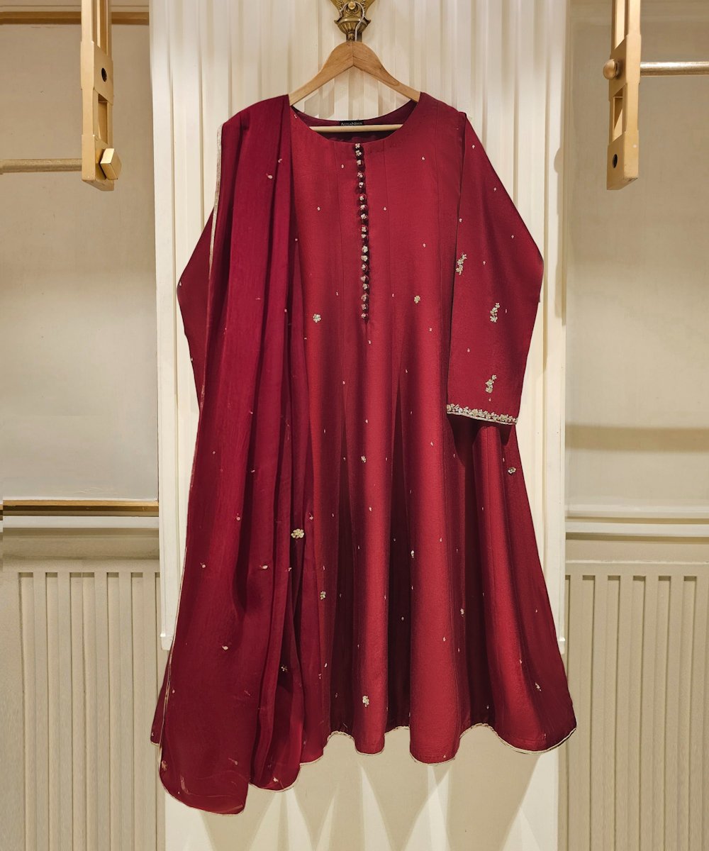 Introducing our elegant embroidered silk net frock shirt with pants and dupatta a perfect choice for those who appreciate intricate detailing and graceful style. Crafted from high-quality silk net fabric, this shirt offers a lightweight and luxurious feel, allowing you to feel comfortable and chic throughout the day. The set comes with a matching dupatta and pant which enhances the overall look and adds a touch of finesse to your outfit.