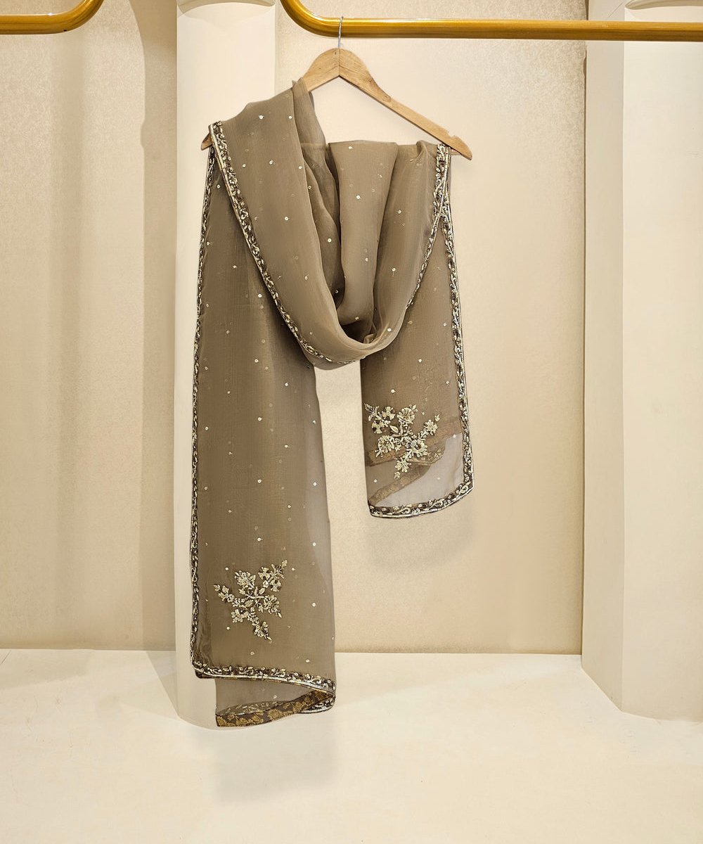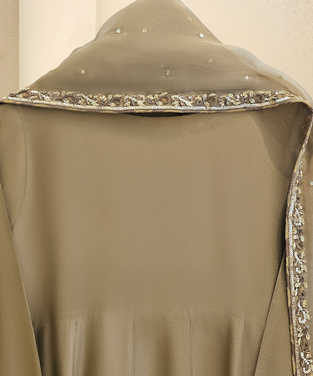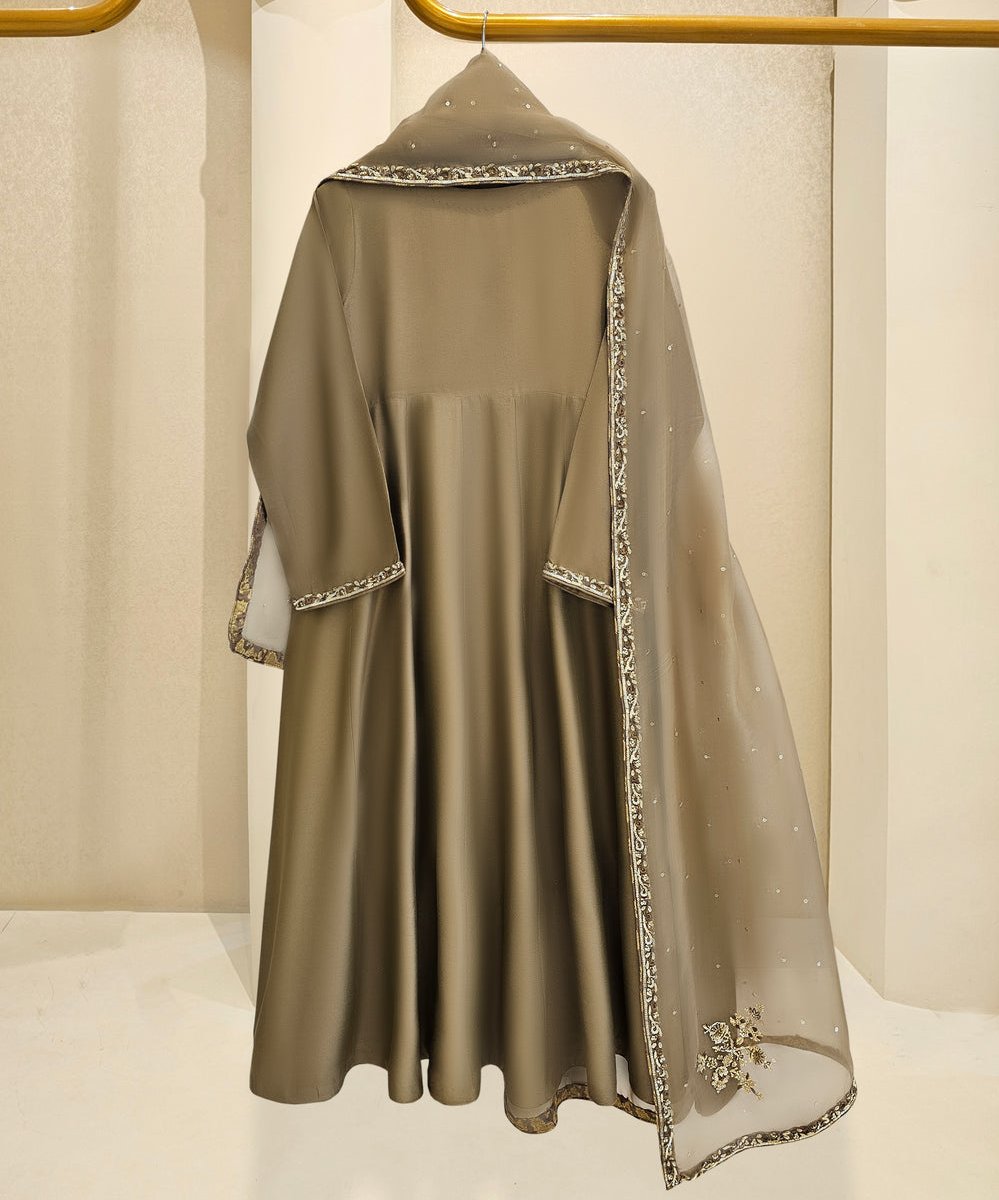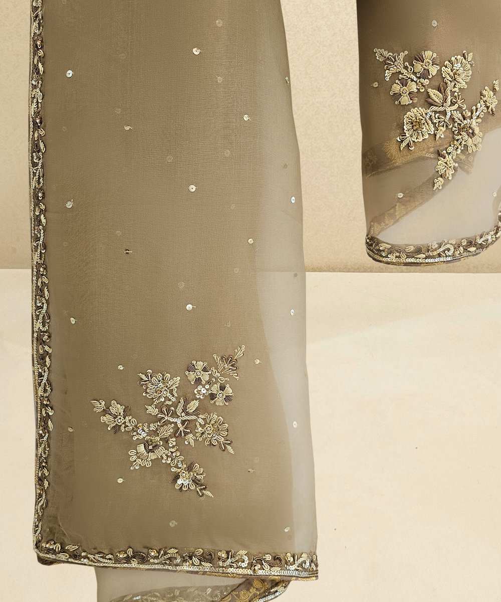 Elegant golden-brown cotton net kalidar paired with a matching raw silk trouser and an organza dupatta featuring four-side gold and copper borders with a central sitara spray. A refined festive outfit blending rich detailing with timeless grace.