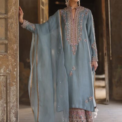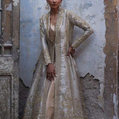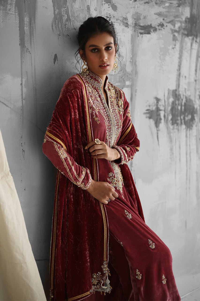 Clementine is a traditional masterpiece: a dull rose pink velvet kurta, lavishly hand-embroidered with gold and silver zardozi work. It is paired with a matching hand-embroidered cutwork izaar and a velvet dupatta, adorned with lace and exquisite bird motifs with crystal embellishments.