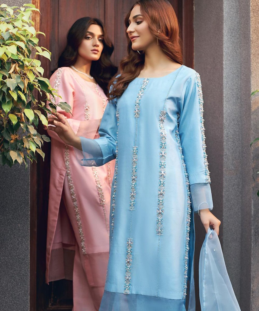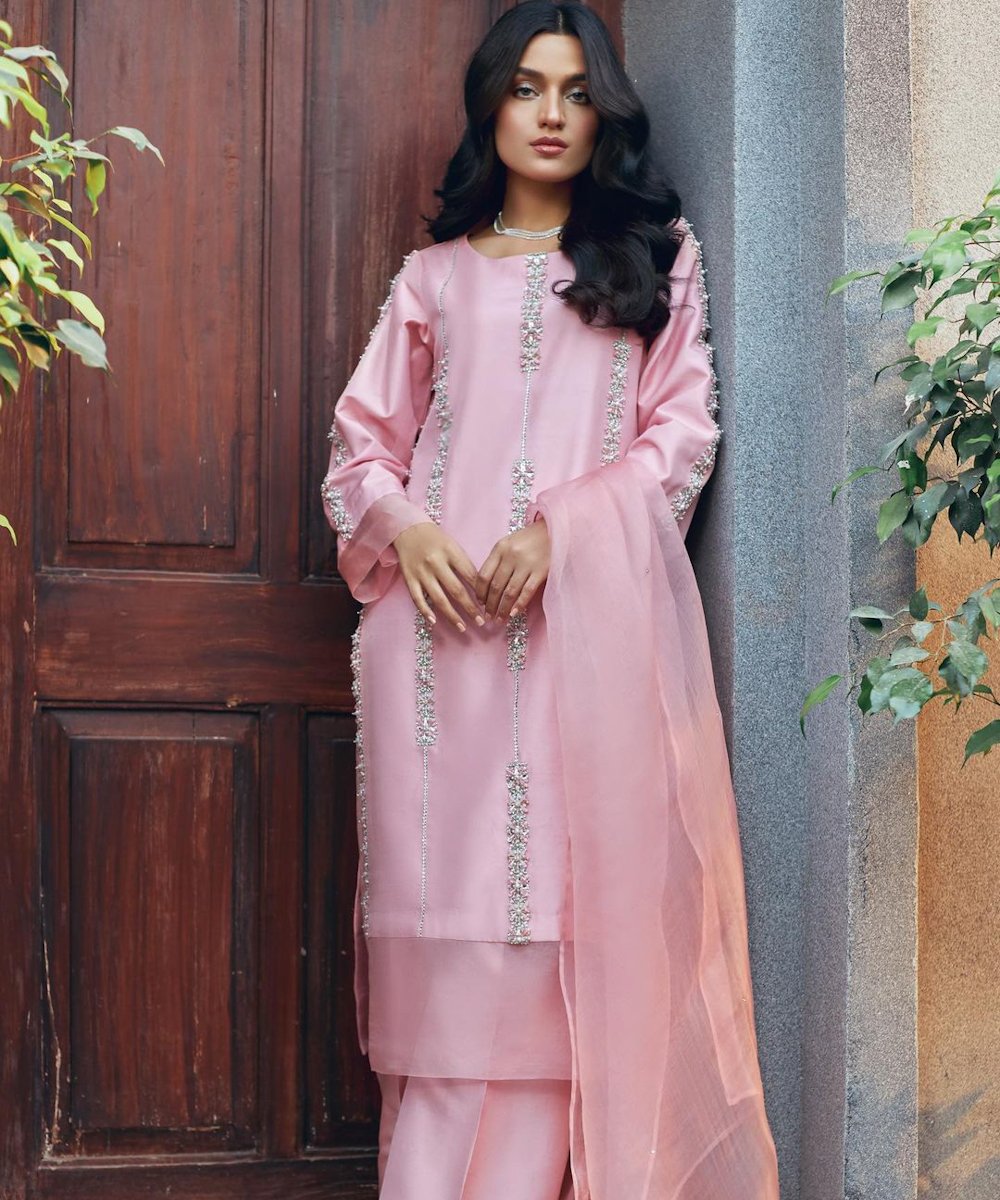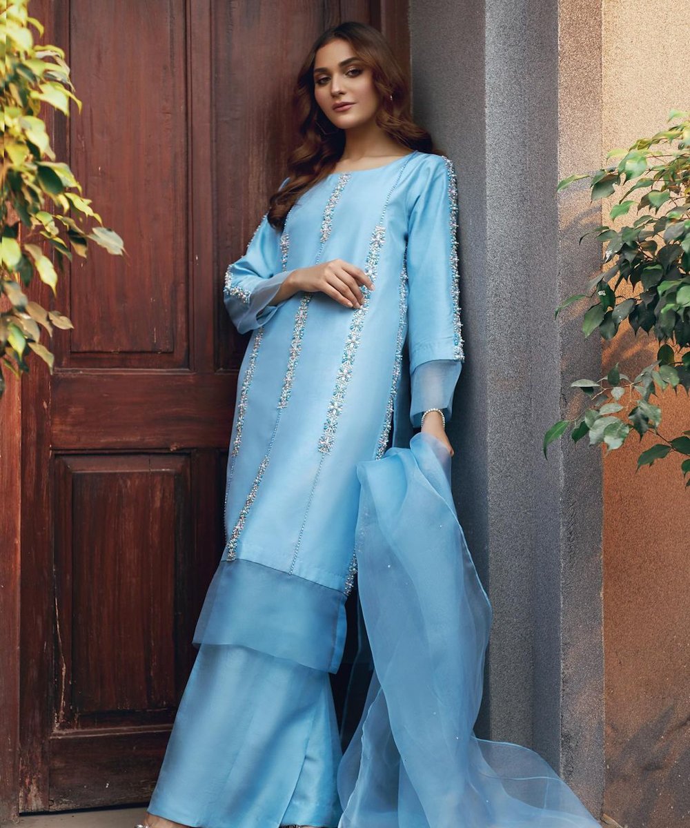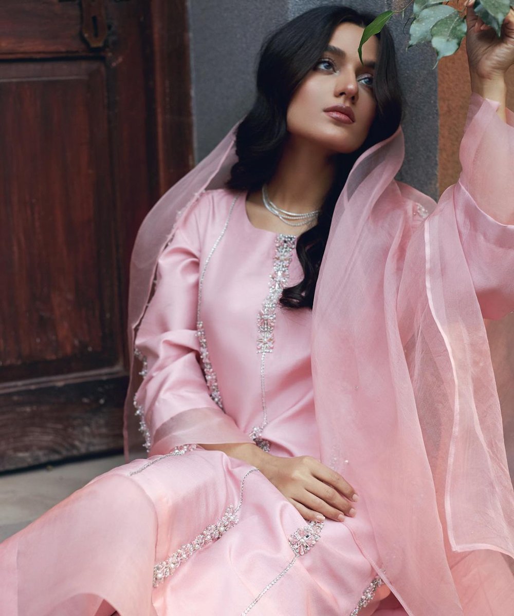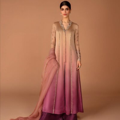 ”LAALI” a light formal features a tusser silk shirt and organza dupatta, paired with raw silk capri. The shirt is delicately adorned with intricate hand work details. The embroidery , featuring exquisite cora and dabka work, adds a touch of timeless craftmanship, making this attire perfect for any occassion….