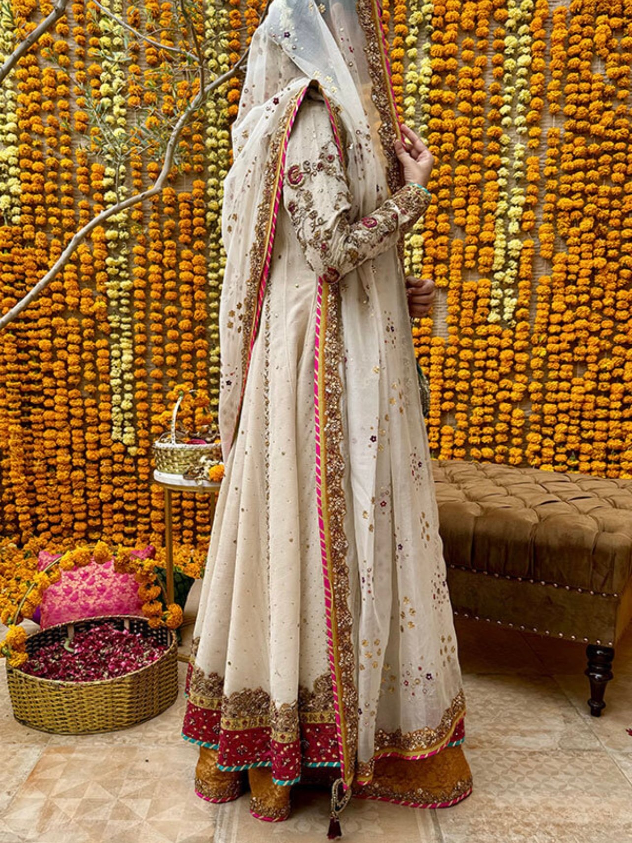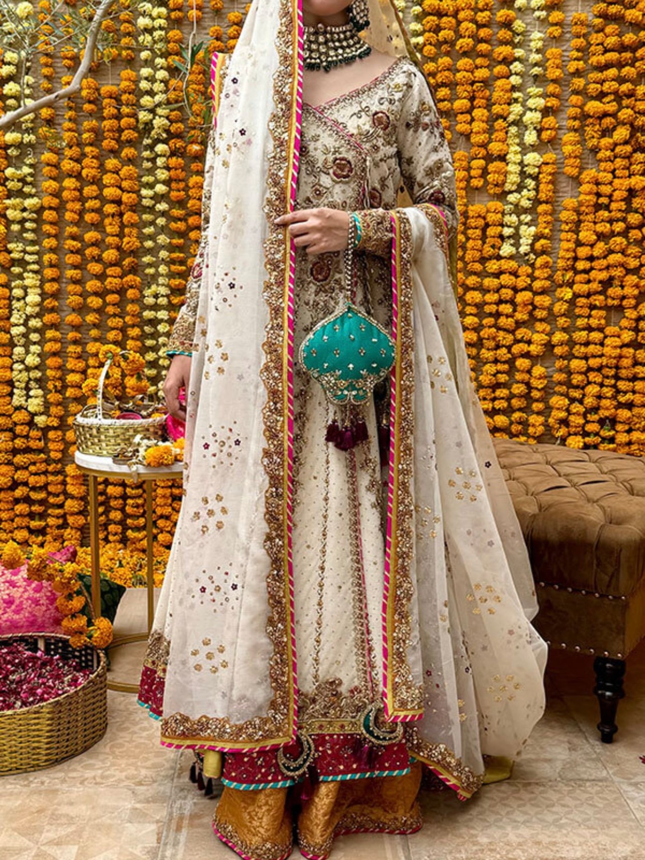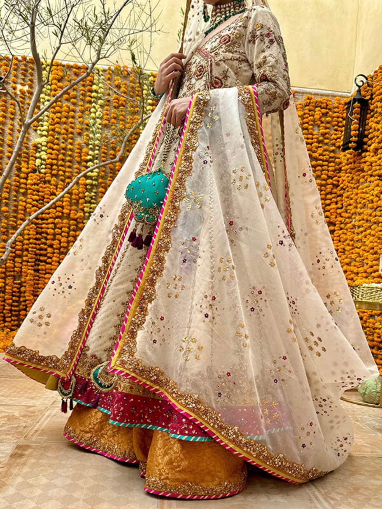 You can’t go wrong with an ivory kalidaar! Especially if it has meticulously selected color elements like MALAIKA! Months of hardwork have gone into designing this beautiful angarkha. A contrasting burnt orange jamavar Dhaka with handworked borders and an ivory pure organza dupatta with heavy borders and spray is all you need for your special day.