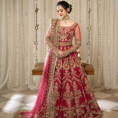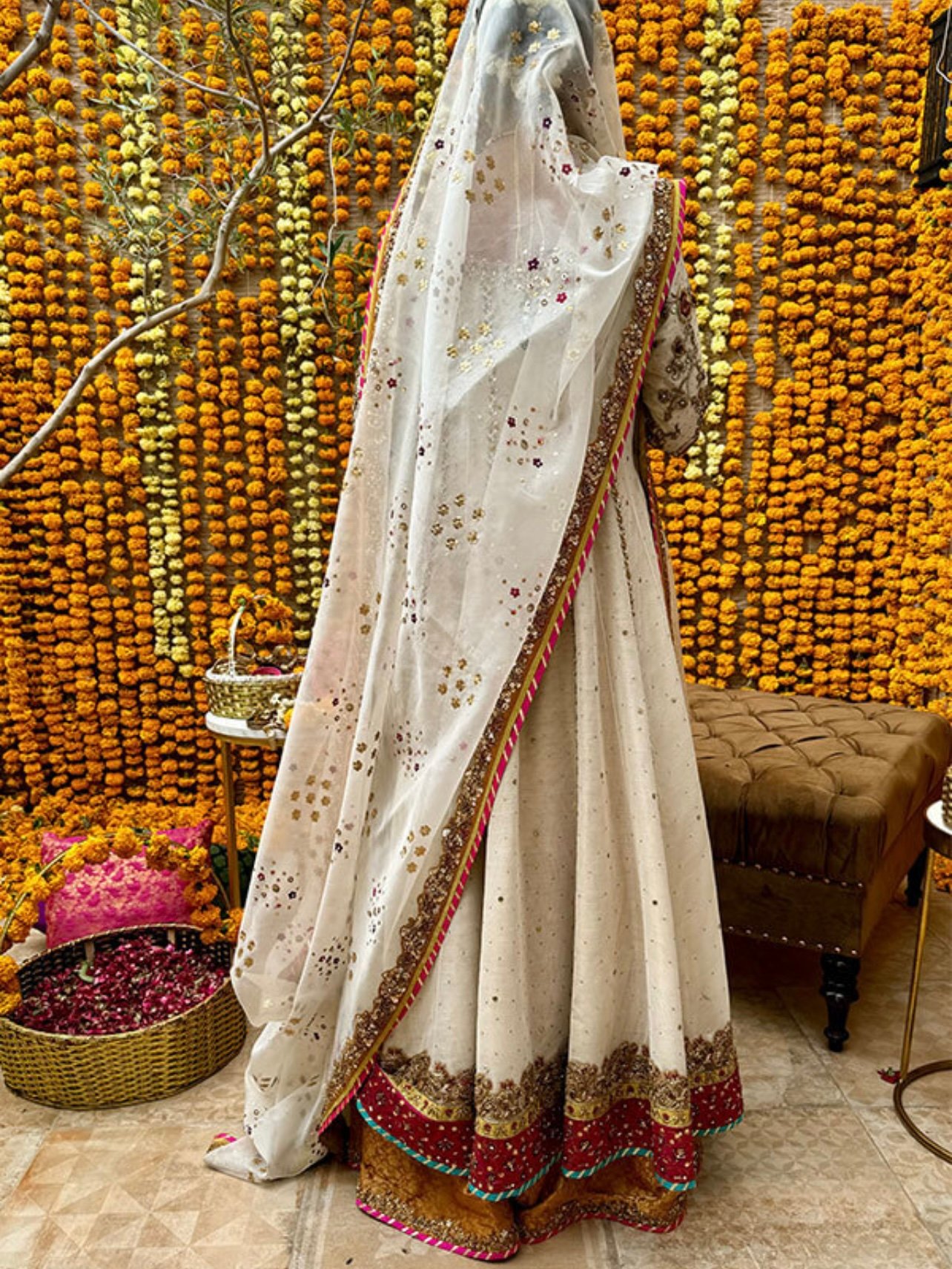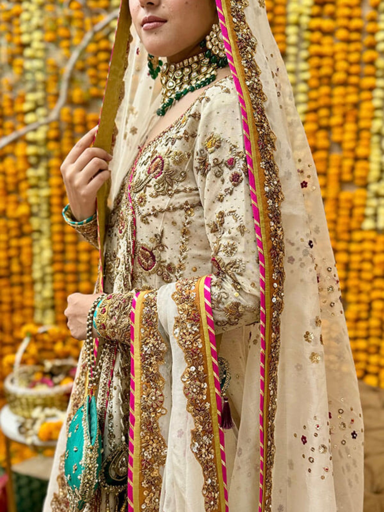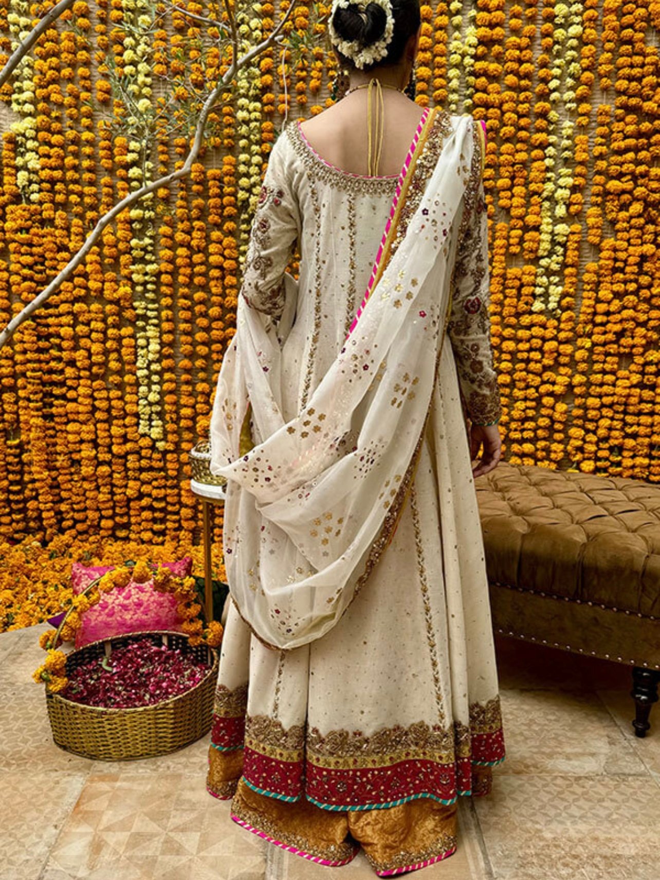 You can’t go wrong with an ivory kalidaar! Especially if it has meticulously selected color elements like MALAIKA! Months of hardwork have gone into designing this beautiful angarkha. A contrasting burnt orange jamavar Dhaka with handworked borders and an ivory pure organza dupatta with heavy borders and spray is all you need for your special day.